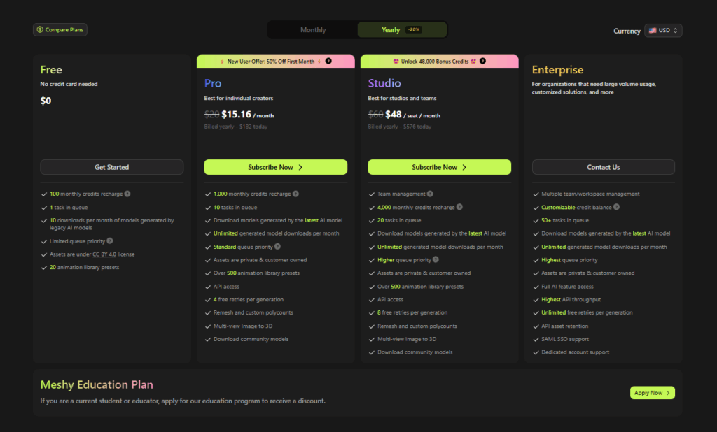- Education / Student discounts – Meshy offers special rates for students and educators to promote adoption in learning environments.