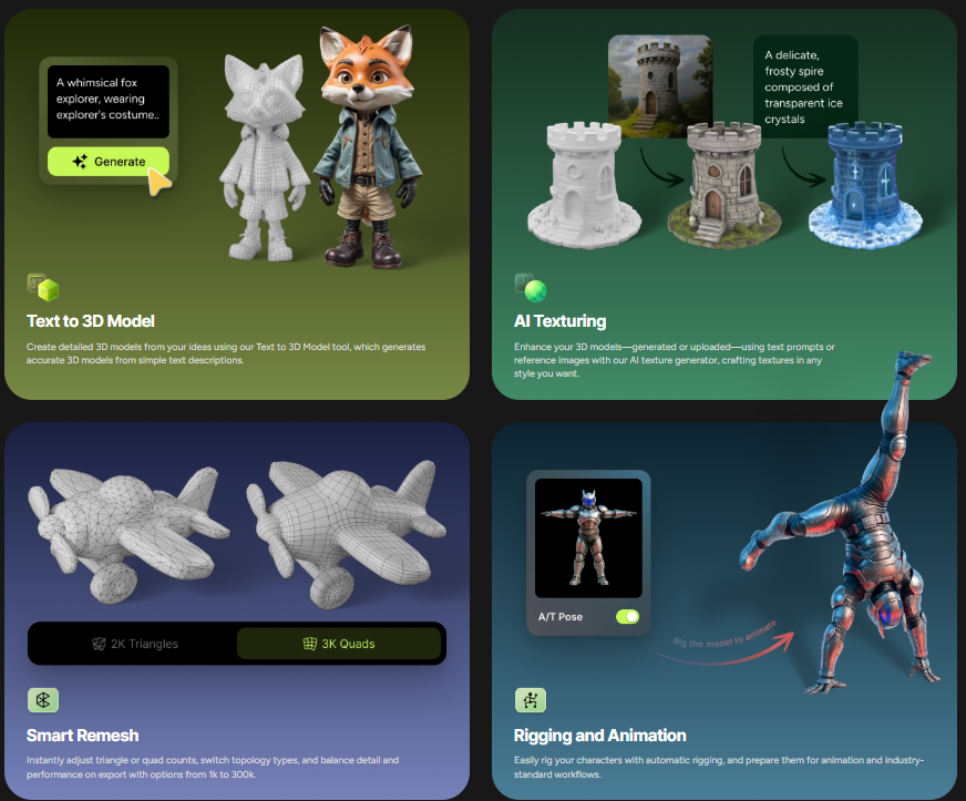 Rigging & Animation | Auto‑rig a mesh, apply motions from library | Very useful for prototyping animated assets |